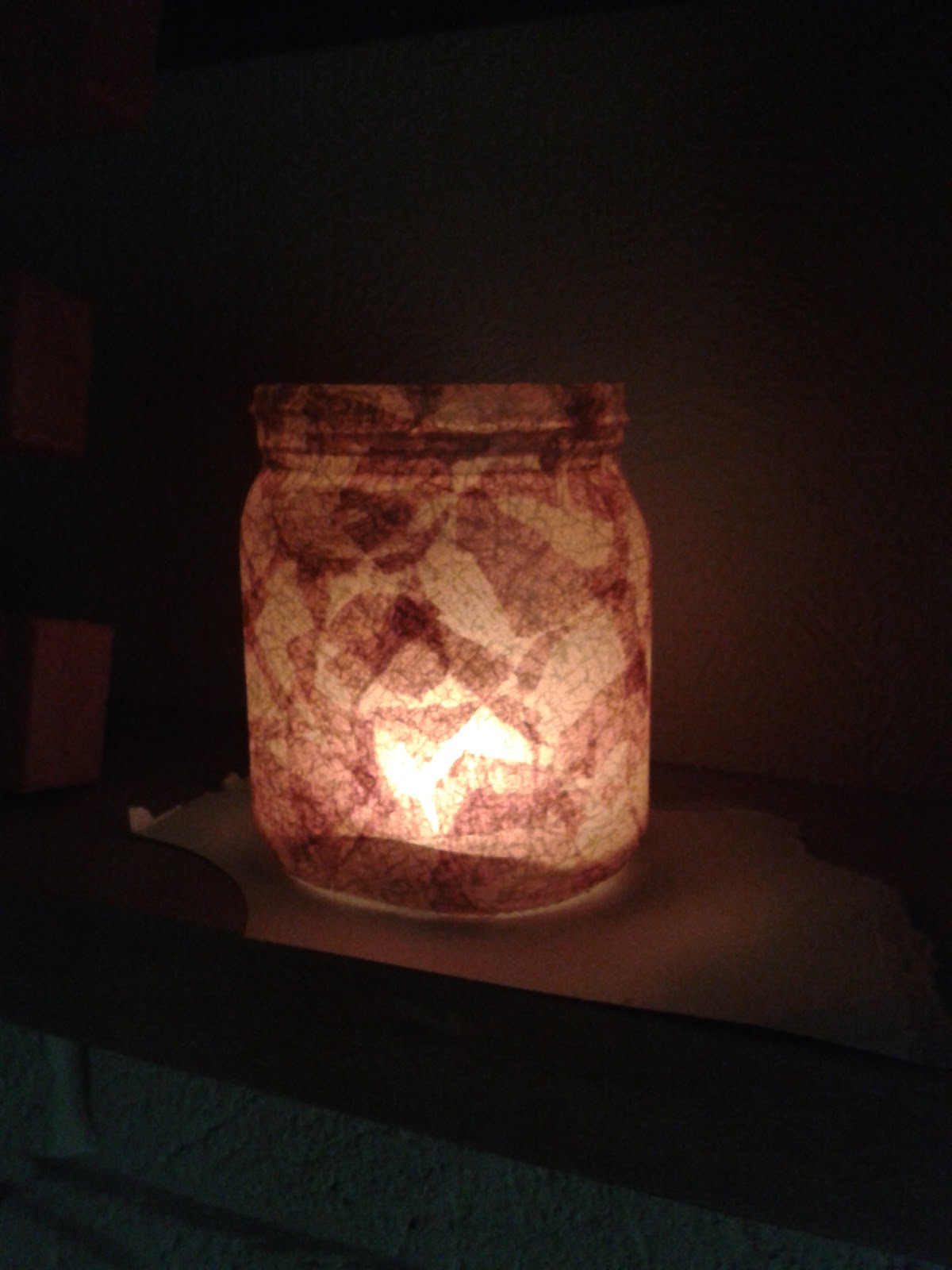The evening is now upon us so I have put a tealight in my first jar to see how it looks. I really like the effect of the overlapping paper, it reminds me of autumn leaves (and helpful fiance says we could use them at Halloween....).